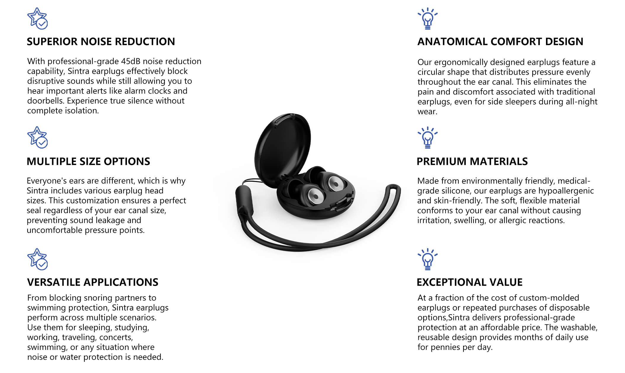 Most earplugs fall out during sleep or cause painful pressure points, especially for side sleepers. Sintra's ergonomic design with multiple size options ensures a secure fit for every ear canal size and shape. The circular design allows the earplugs to turn freely without losing their noise-blocking seal, staying comfortably in place all night regardless of your sleeping position.