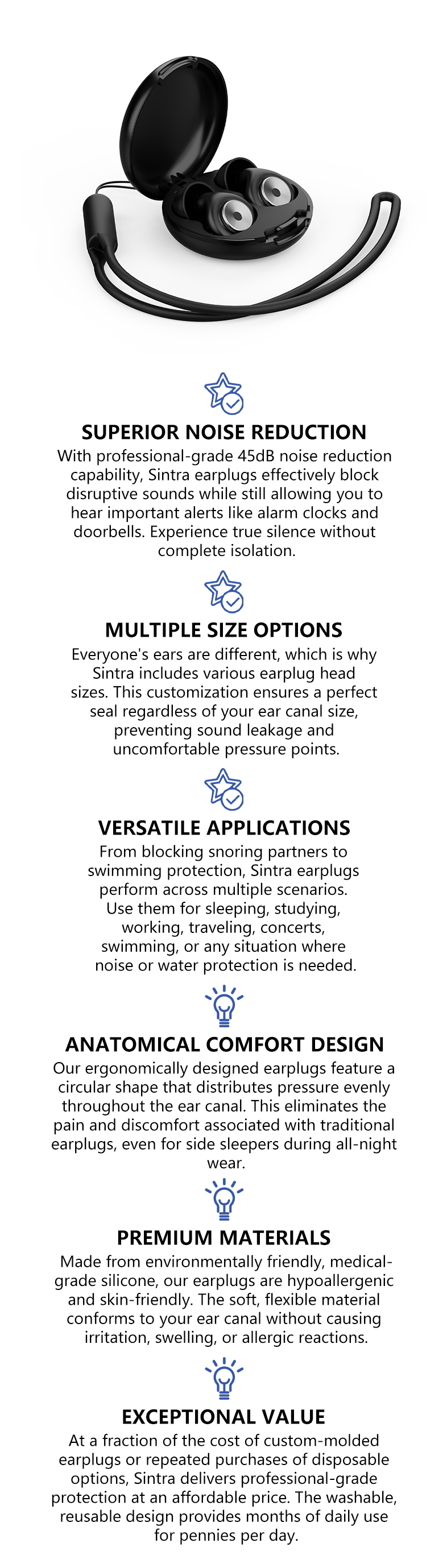 Sintra earplugs go beyond bedtime use with their versatile, waterproof design. Use them for peaceful sleep, concentrate in noisy work environments, protect your hearing at concerts or loud events, block distractions while studying, or keep water out while swimming. Their durable construction and washable materials make them ideal for daily use across all these scenarios.